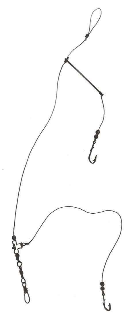 Dieser Paternoster ist mit zwei messerscharfen Haken der Größe 4 ausgestattet.