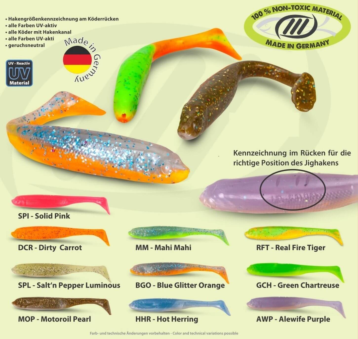 Dabei ist es gelungen mit der Farbe Hot Herring (HHR) sogar einen blauen Köder in UV-aktiver Version zu kreieren, was eine wirkliche Neuheit darstellt und was es in diesem Ausmaß an Effekt wahrscheinlich so noch nicht gegeben hat.
